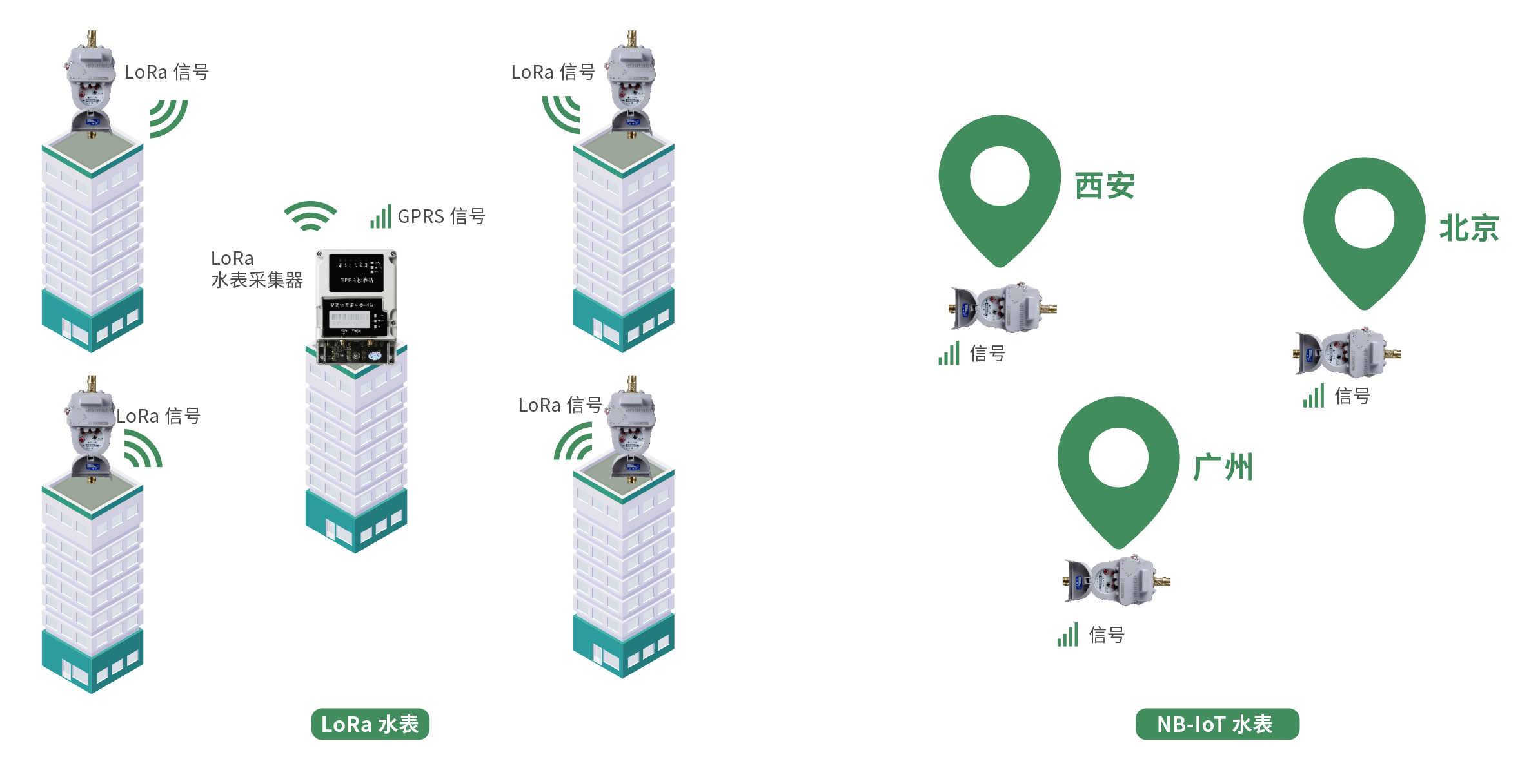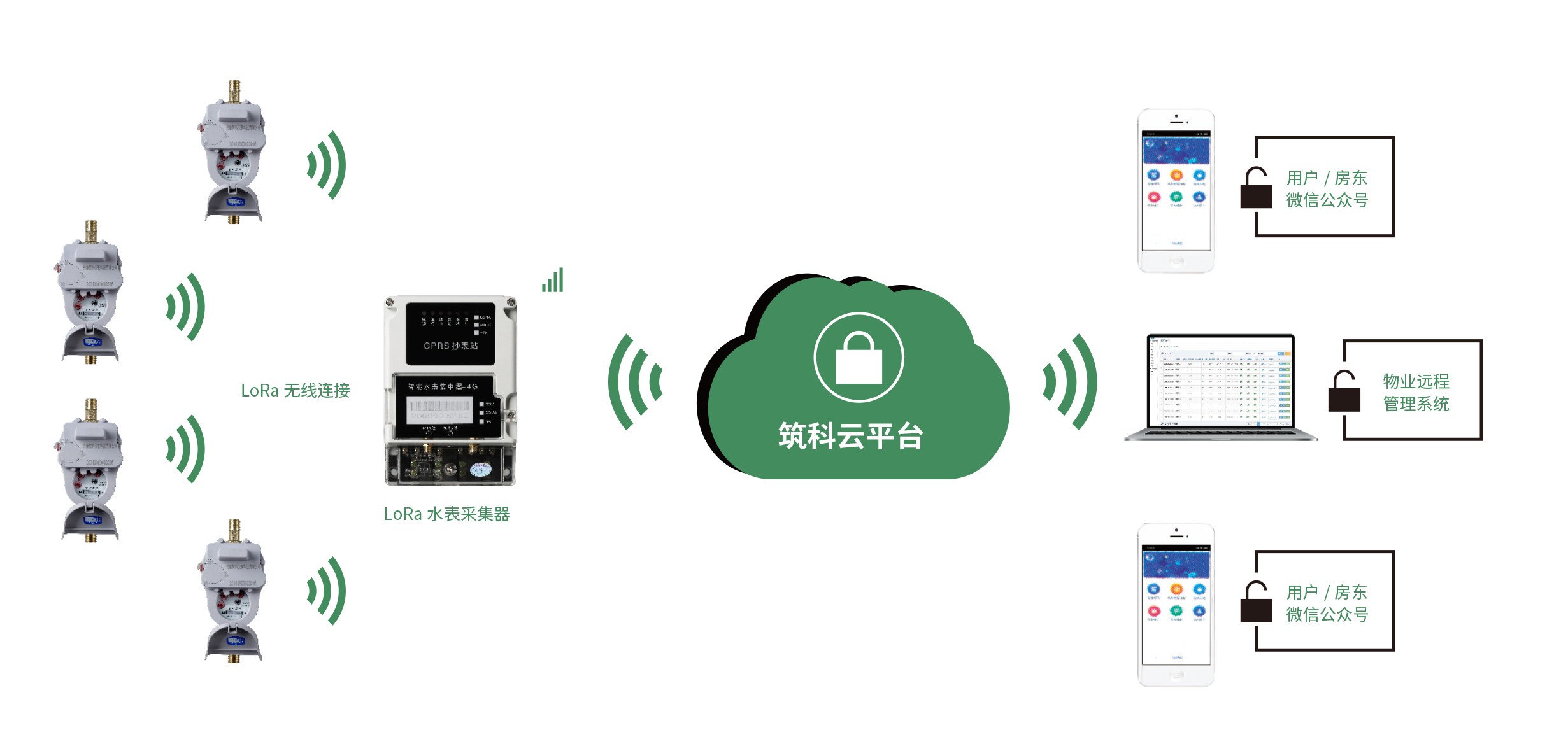 LoRa无线转GPRS水表本方案适合水表相对分散单独安装的方式,例如—层楼有几十个的房间(商铺),水表单独安装每—房间(商铺)里,在所有水表中间位置放置一台LoRa水表采集器。水表与采集器均内置了LoRa无线通讯模块,无需布线,采集器无线与水表通讯,并将数据通过采集器所内置流量卡的GPRS网络连接到系统云服务器。